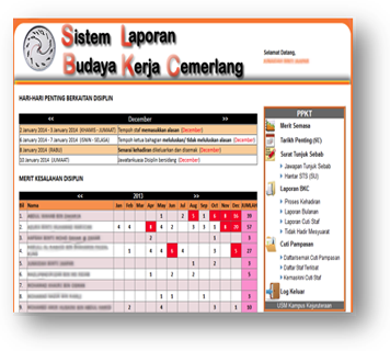 - Memudahkan laporan BKC (Budaya Kerja Cemerlang) disediakan dengan mudah untuk pemantauan Ketua Jabatan dan Jawatankuasa Disiplin secara keseluruhan dan semua staf dapat melihat merit masing-masing sahaja.
